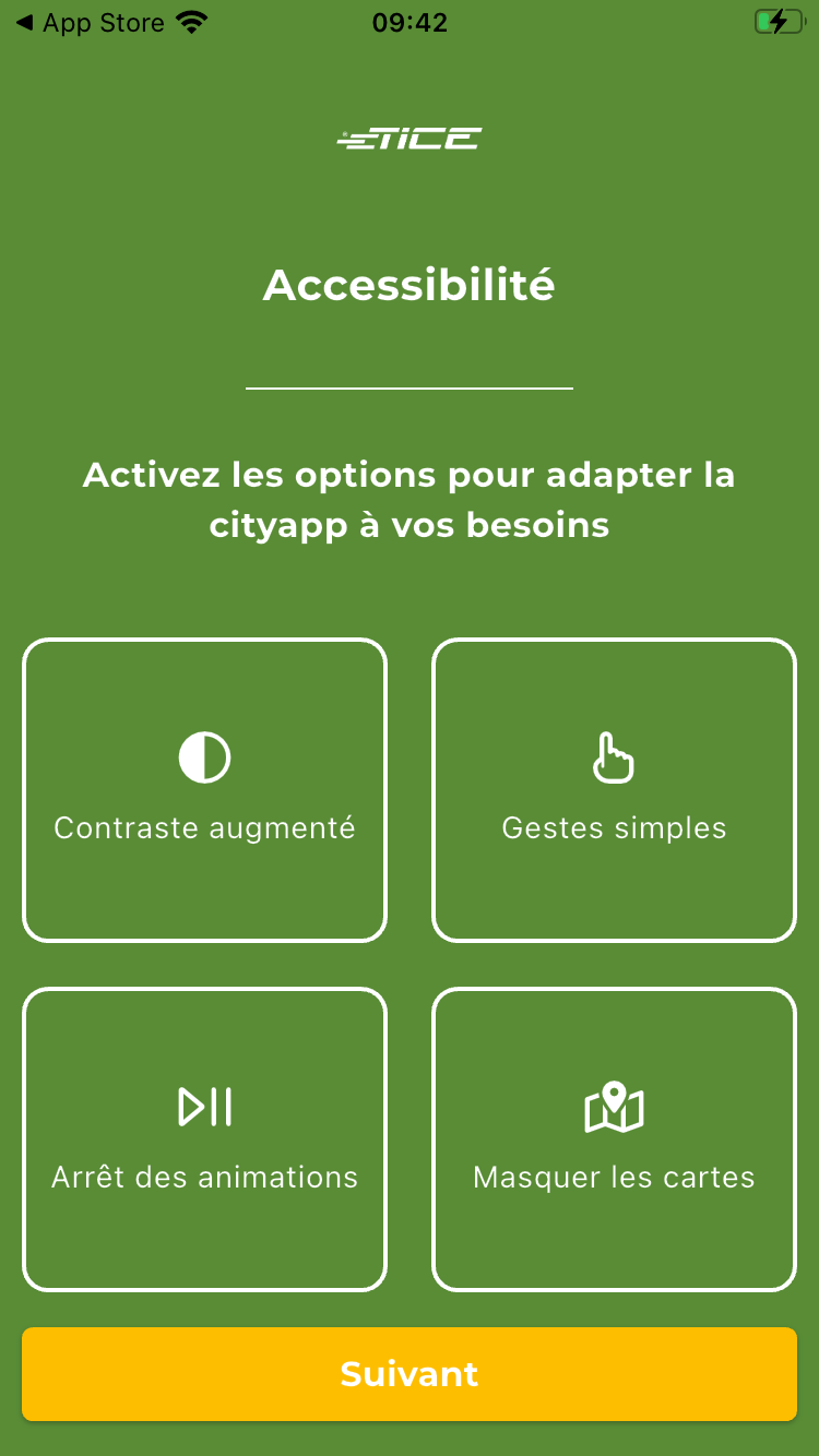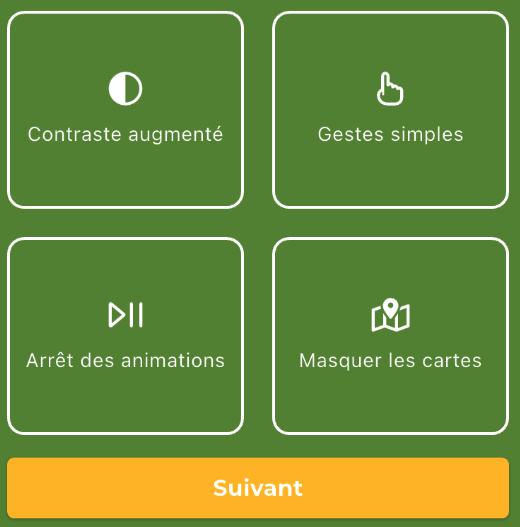 Dans le parcours d'accueil, l'étape présentant des fonctionnalités d'amélioration de l'accessibilité de l'application et en particulier les textes des boutons ne sont pas assez contrastés afin d'être perceptible par tout le monde. Ce qui est particulièrement bloquant notamment pour les personnes visuellement déficientes qui auraient besoin de renforcer les contrastes.