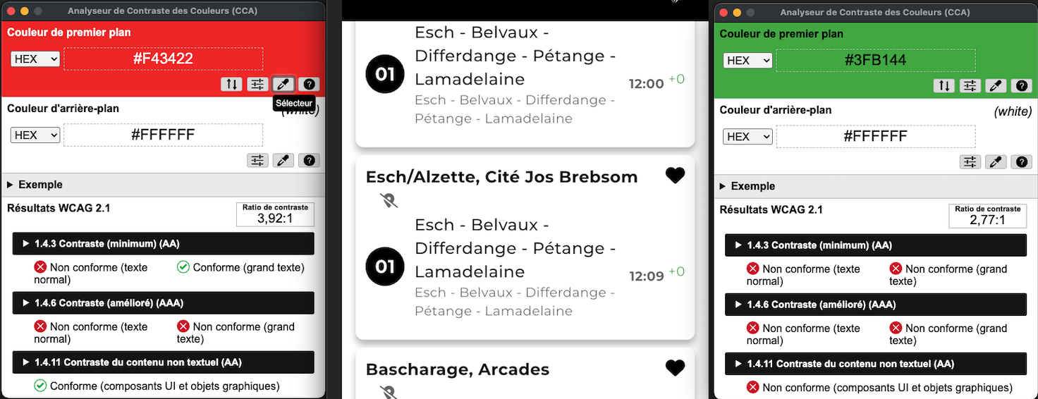 Dans les favoris ainsi que dans le détail des arrêts, les indications de retard ou de transports à l'heure sont présentés sous forme de texte coloré en vert et en rouge. Ces couleurs ne sont pas assez contrastées avec la couleur de fond blanc pour être perceptible par tout le monde. Avec :