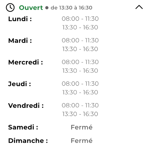 Dans la section "Contact", le composant qui affiche et masque les horraires d'ouverture ne présente pas son état actif ou non aux technologies d'assistance.