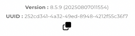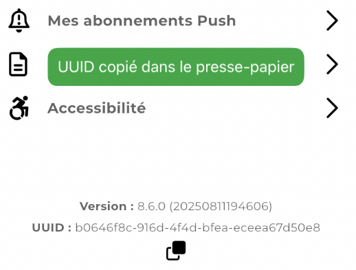 Dans la section "Mon profil", le bouton "Copier les informations de l'application" ne reprend pas le texte visible: "Version: 8.5.9 (20250807011554) UUID: b0646f8c-916d-4f4d-bfea-eceea67d50e8"