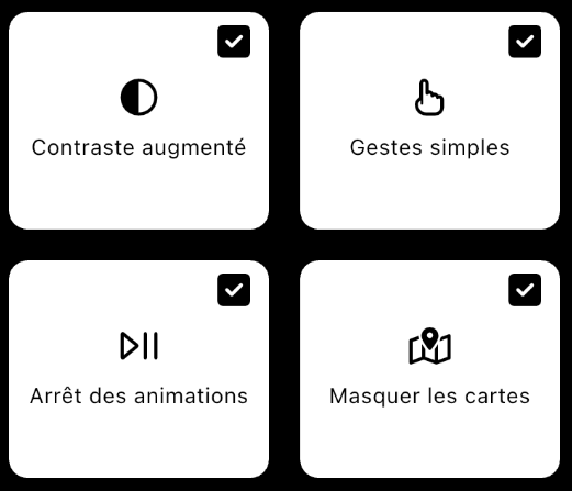 Dans le parcours de première connexion, les boutons "Contraste augmenté", "Gestes simples", "Arrêt des animations" et "Masquer les cartes" ne sont pas atteignables au clavier.